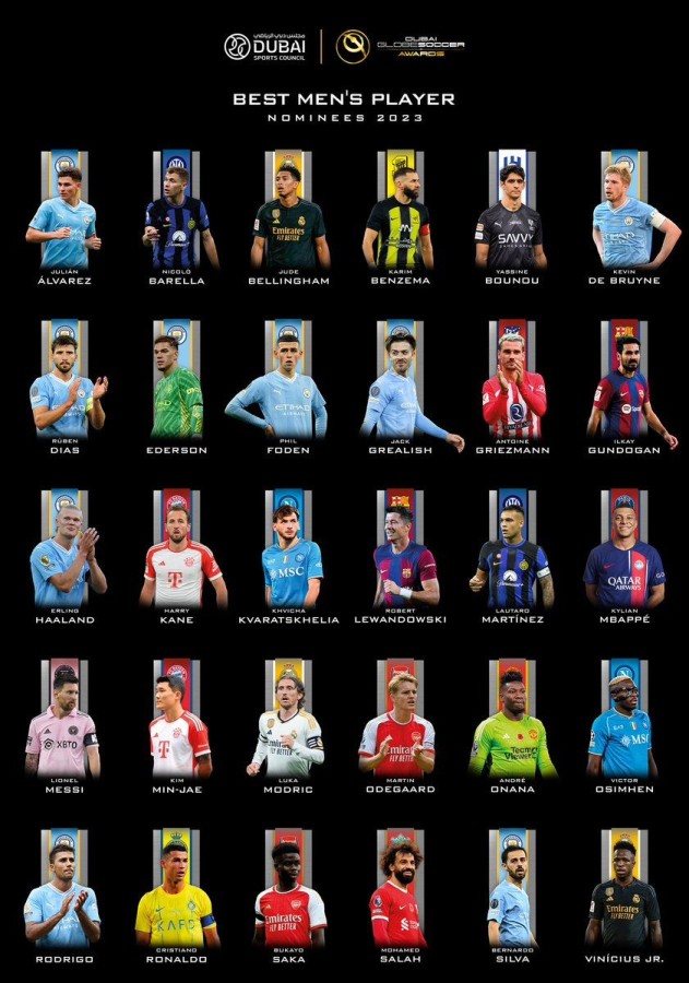Globe Soccer Awards წლის საუკეთესო ფეხბურთელის ნომინანტები: ნიკოლო ბარელა, ხულიან ალვარესი, ჯუდ ბელინგემი, კარიმ ბენზემა, კევინ დე ბრუინი, იასინ ბუნუ, რუბენ დიასი, ედერსონი, ფილ ფოდენი, ჯეკ გრილიში, ანტუან გრიზმანი, ილკაი გიუნდოგანი, ერლინგ ჰოლანდი, ჰარი კეინი. ხვიჩა კვარაცხელია, კილიან მბაპე, რობერტ ლევანდოვსკი, ლაუტარო მარტინესი, ლიონელ მესი, კიმ მინ ჯე, ლუკა მოდრიჩი, მარტინ ედეგორი, ანდრე ონანა, ვიქტორ ოსიმენი, როდრი, კრიშტიანუ რონალდუ, ბუკაიო საკა, ვინისიუსი, ბერნარდო სილვა, მოჰამედ სალაჰი.