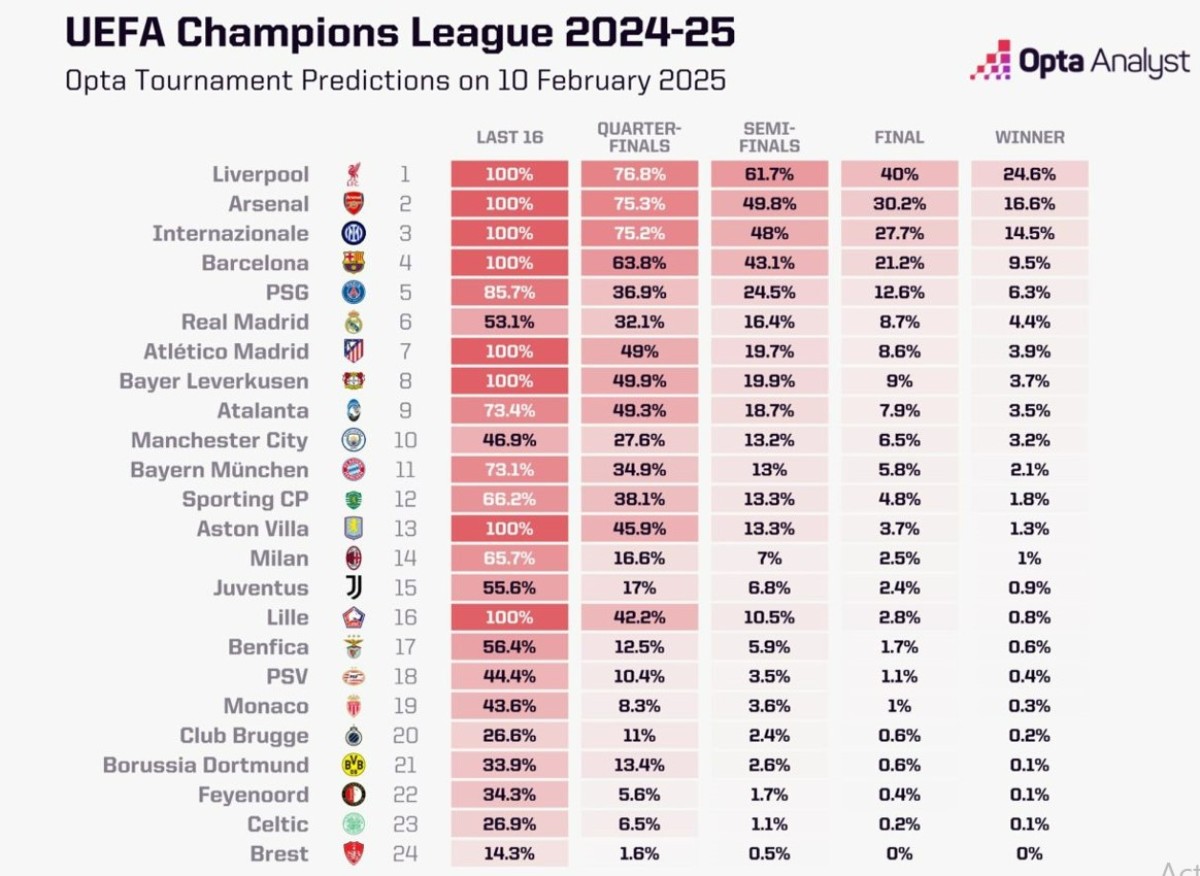 პორტალის ინფორმაციით, გამარჯვების ყველაზე დიდი შანსი ინგლისურ „ლივერპულს“ აქვს - 24,6%. ტიტულის მოპოვების შემდეგი ფავორიტი „არსენალია,“ გამარჯვების 16.6% შანსებით. მესამე შესაძლო გამარჯვებული არის „ინტერი,“ რომლის ჩემპიონთა ლიგის მოგების ალბათობა 14,5%-ია.