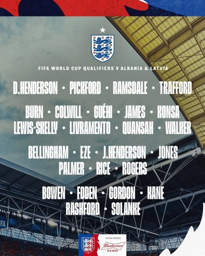 ინგლისის ნაკრებში 2 დებიუტანტი იქნება "ნიუკასლის" მცველი ნენ ბერნს და ლონდონის "არსენალიდან" მაილს ლუის-სკელი. ასევე ხანგრძლივი პაუზის შემდეგ ნაკრებში ბრუნდებიან მარკუს რაშფორდი და ჯორდან ჰენდერსონი.