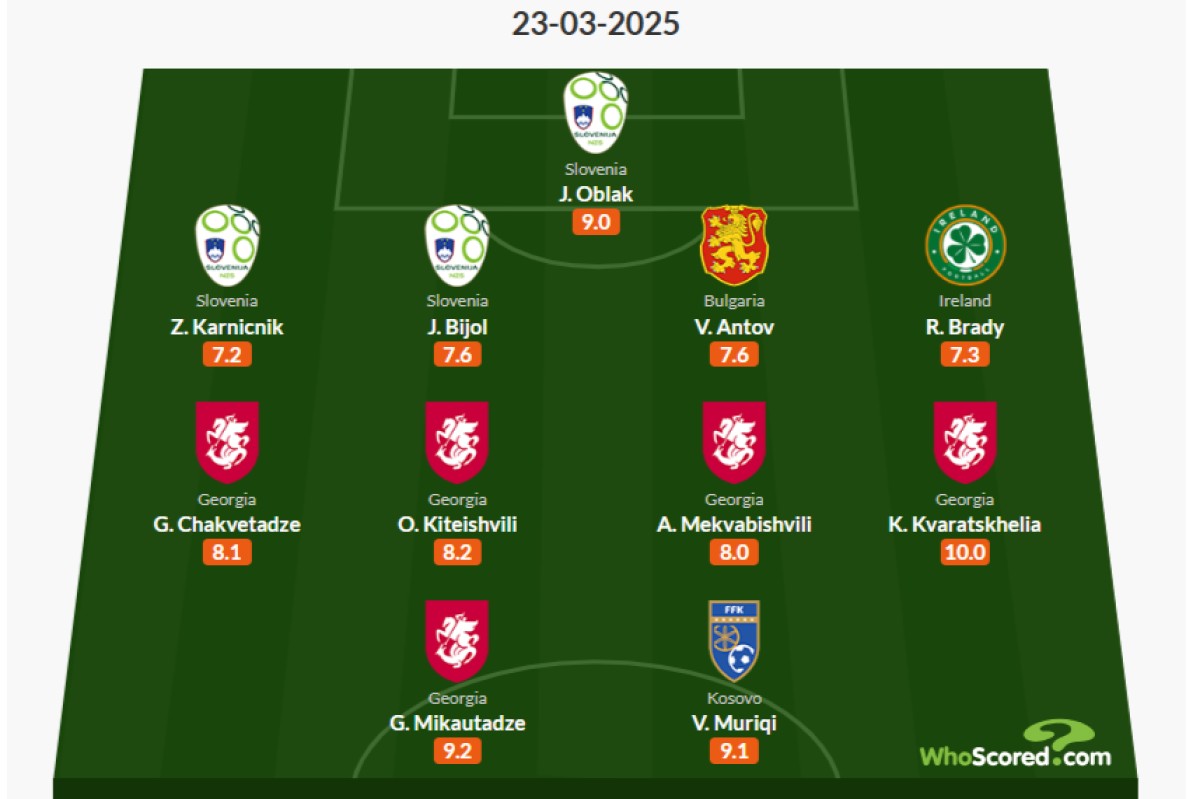 სიმბოლურ ნაკრებში ხუთი ქართველის გარდა, სამი სლოვენიელი ფეხბურთელია, თითო წარმომადგენელი კი, ირლანდიას, ბულგარეთსა და კოსოვოს ჰყავთ.