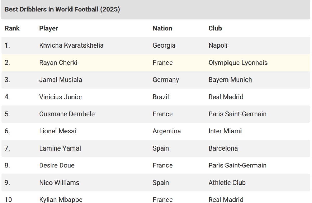 ბრიტანულმა გამოცემა Givemesport-მა მსოფლიოს საუკეთესო დრიბლიორები დაასახელა, სადაც პირველი ადგილი საქართველოს ნაკრებისა და "პარი სენ-ჟერმენის" შემტევმა ხვიჩა კვარაცხელიამ დაიკავა, მეორე ადგილზე რაიან შერკია, ხოლო მესამეზე ჯამალ მუსიალა გავიდა.