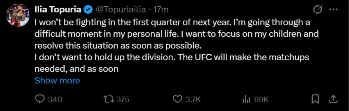 UFC-ის მსუბუქი დივიზიონის ქართველმა ჩემპიონმა ილია თოფურიამ რამდენიმე წუთის წინ სოციალურ ქსელში პოსტი გამოაქვეყნა, სადაც "ელ მატადორმა" სამომავლო გეგმებთან დაკავშირებით კომენტარი გააკეთა.