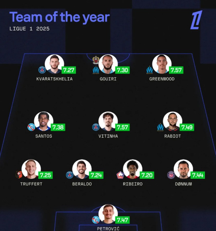 სიმბოლურ ნაკრებში ხვიჩა კვარაცხელიასთან ერთად პარიზული კლუბიდან ვიტინია და ლუკას ბერალდო მოხვდა.