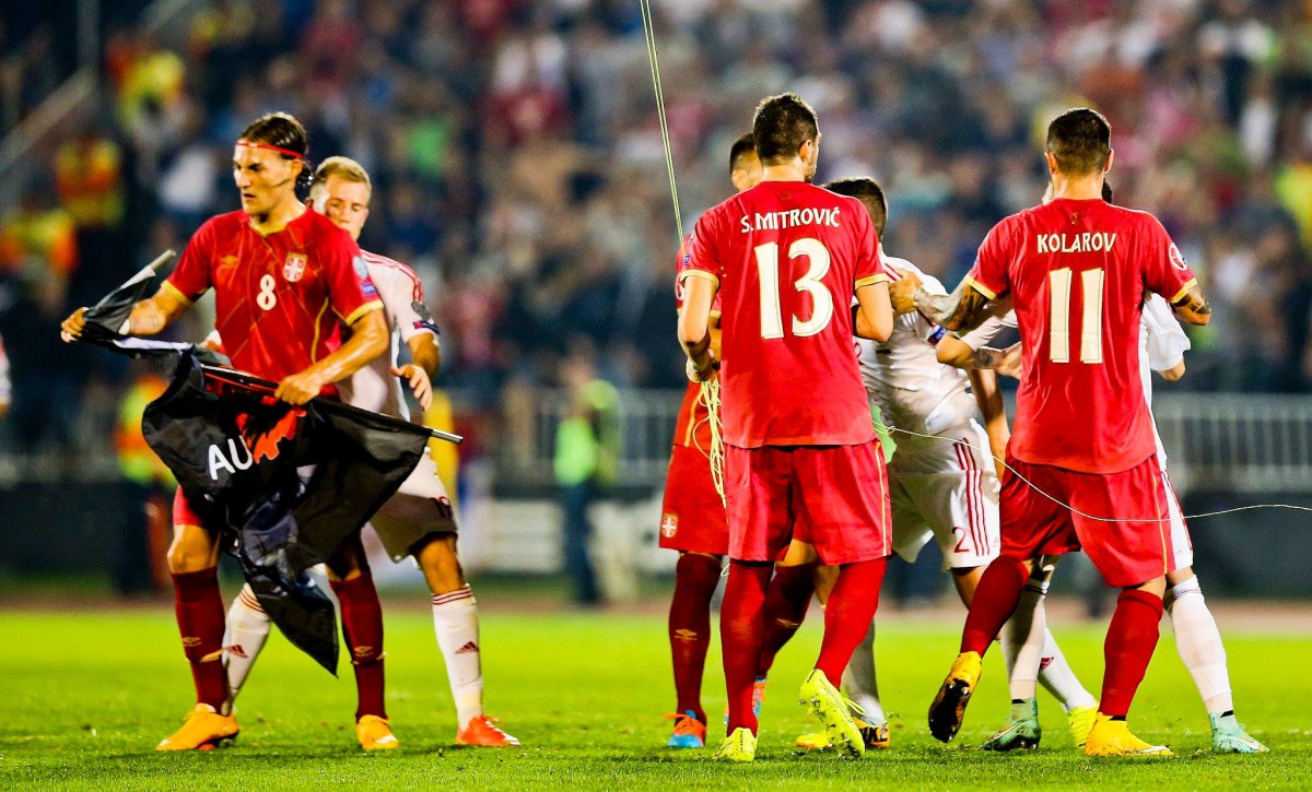 პირველი ტაიმის მიწურულს სტადიონზე უპილოტო მცირე ზომის თვითმფრინავი გამოჩნდა ალბანეთის დროშით. სერბმა მცველმა შტეფან მიტროვიჩმა დახია ალბანეთის დროშა, რასაც მოედანზე ჩხუბი მოჰყვა. არეულობა იყო ტრიბუნებზეც. ზოგიერთმა სერბმა გულშემატკივარმა მინდორზე გადაინაცვლა და ალბანელი ფეხბურთელების ცემას შეეცადა, თუმცა მთავარმა მსაჯმა მარტინ ანტკინსონმა მატჩის შეწყვეტის გადაწყვეტილება მიიღო და ფეხბურთელები მოედნიდან გაიყვანა.