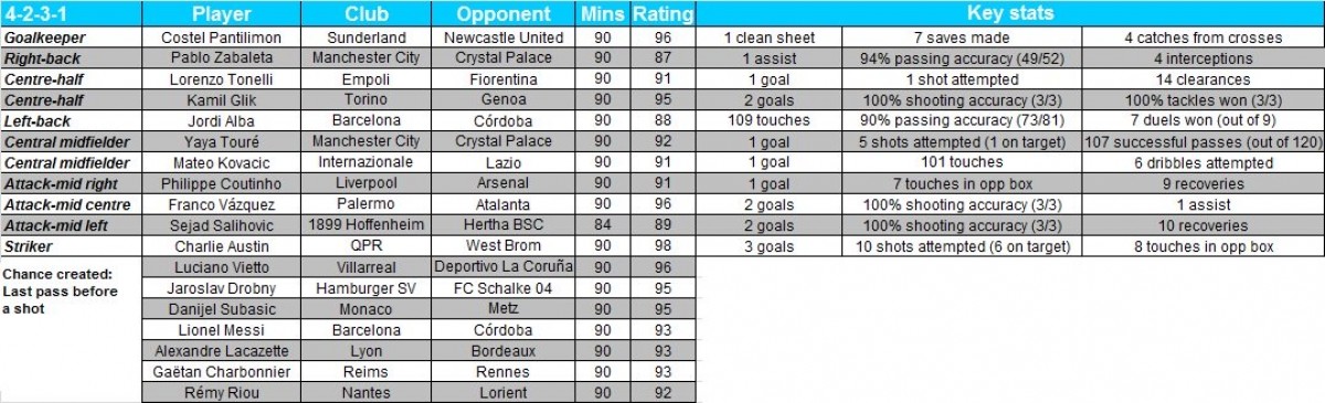 საუკეთესო 11 ფეხბურთელის სია შემდეგნაირად გამოიყურება: კოსტელ პანტილიმონი (“სანდერლენდი”), პაბლო ზაბალეტა (“მანჩესტერ სიტი”), ლორენცო ტონელი (“ემპოლი”), კამილ გლიკი (“ტორინო”), ხორდი ალბა (“ბარსელონა”), იაია ტურე (“მანჩესტერ სიტი”), მატეო კოვაჩიჩი (მილანის “ინტერი”), ფილიპე კოუტინიო (“ლივერპული”), ფრანკო ვასკესი (“პალერმო”), სეად სალიჰოვიჩი (“ჰოფენჰაიმი”), ჩარლი ოსტინი (ქპრ).