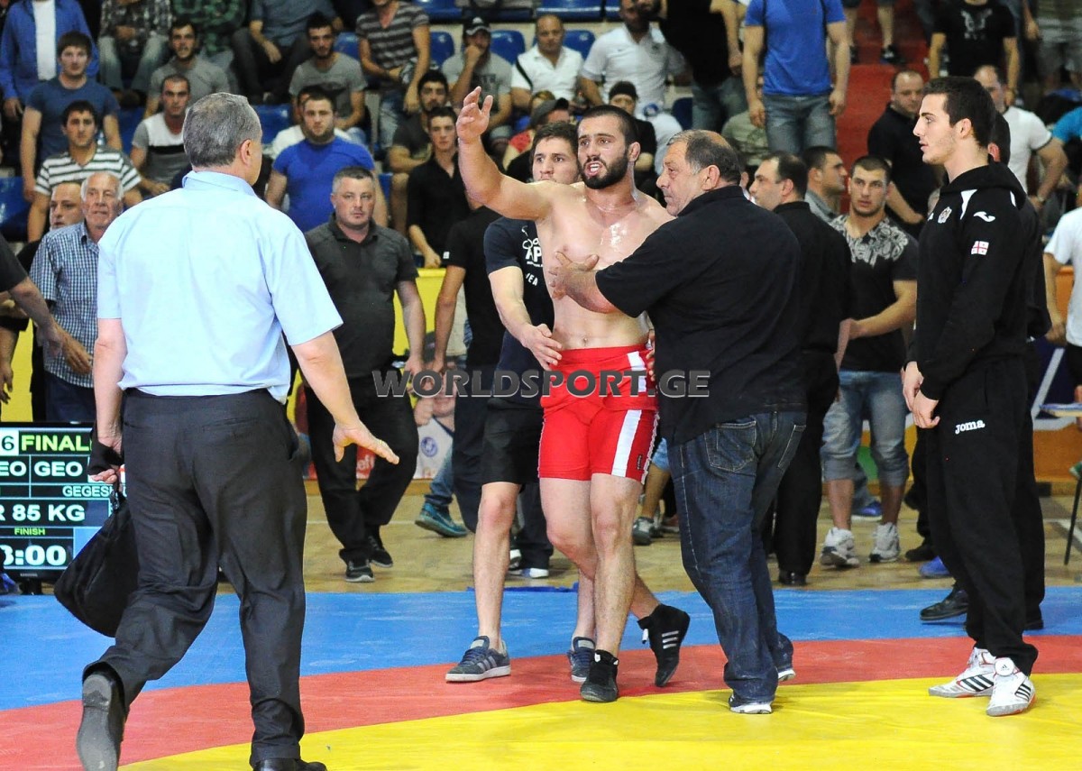 აურზაური 85 კილოგრამი წონითი კატეგორიის ფინალს მოჰყვა, რომელშიც ერთმანეთს საქართველოს ნაკრების გამოცდილი წევრი ვლადიმერ გეგეშიძე და ახალგაზრდებს შორის ევროპის სამგზის პრიზიორი რობერტ ქობლიაშვილი ხვდებოდნენ. მეორე პერიოდში, მაშინ როდესაც ანგარიში 2:2 იყო და ორივე მოჭიდავეს თითო გაფრთხილება ჰქონდა მიღებული, ბოლო ქულის ფაქტორის გამო წამგებიან პოზიციაში მყოფმა ქობლიაშვილმა მეტოქეს შედარებით აქტიურად შეუტია. ხალიჩის მსაჯმა გელაშვილმა “ოქროს ფასი” გაფრთხილების მიცემისგან თავი შეიკავა, რითაც მაყურებელთა დიდი ნაწილის გარდა რამდენიმე კოლეგაც გააღიზიანა. მსაჯების დაპირისპირების პარალელურად, ხალიჩის არბიტრის მისამართით ტრიბუნიდან სხვადასხვა ზომის და ფორმის საგნების სროლა დაიწყო. ერთმა ჩუბინმა გაარტყა კიდეც სამიზნეს. საფინალო სირენას კი გაცილებით დიდი აურზაური მოჰყვა და მდგომარეობა უკიდურესად დაიძაბა.