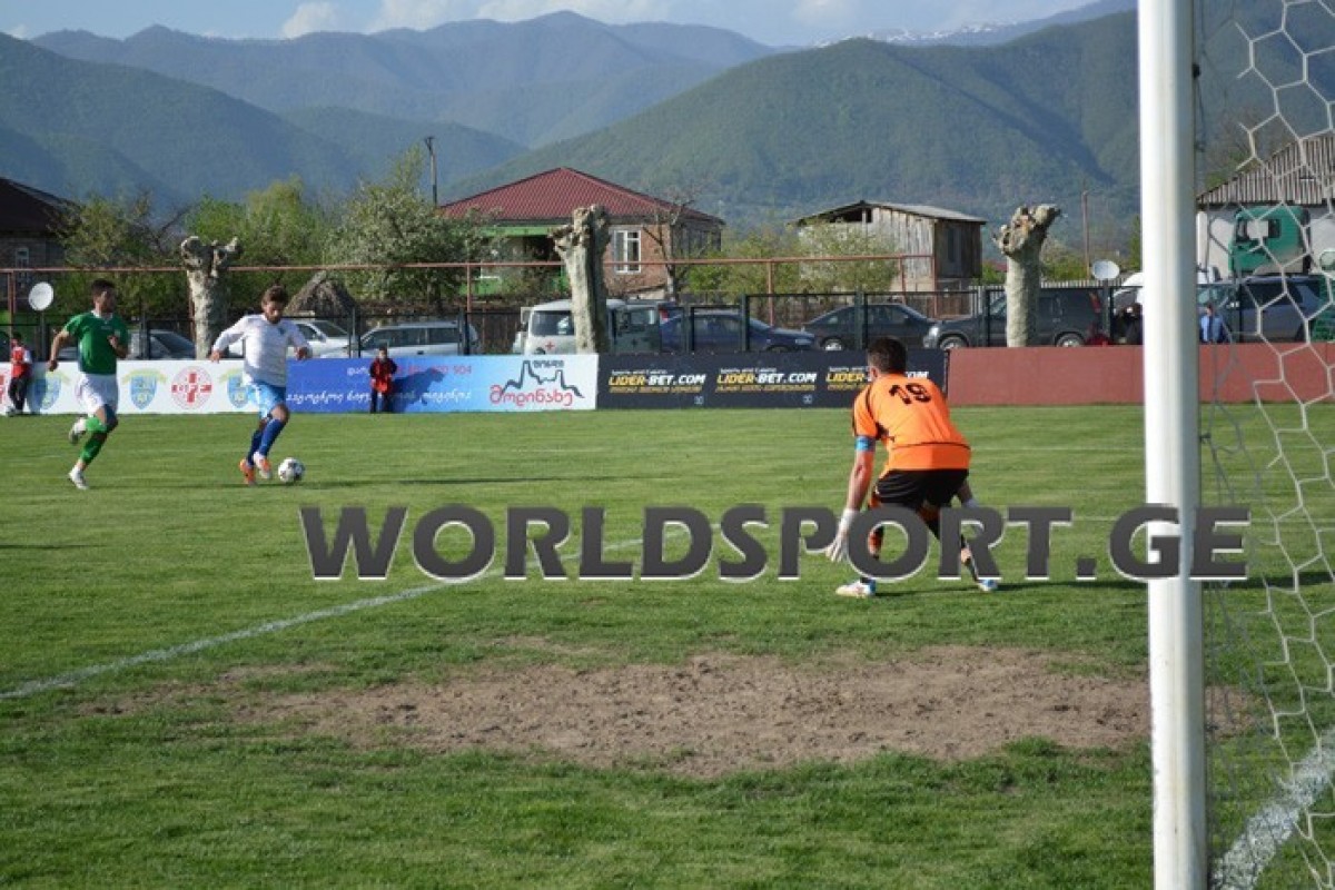 მასპინძელთა მონდომებამ შედეგი მესამე ცდაზე გამოიღო. 28-ე წუთზე საჩხერელთა ლამაზი კომბინაციის შემდეგ გაბედავა მეკარესთან პირისპირ აღმოჩნდა და გამოზომილი დარტყმით ბობღიაშვილს საკუთარი კარის გადარჩენის არანაირი შანსი არ დაუტოვა - 1:0