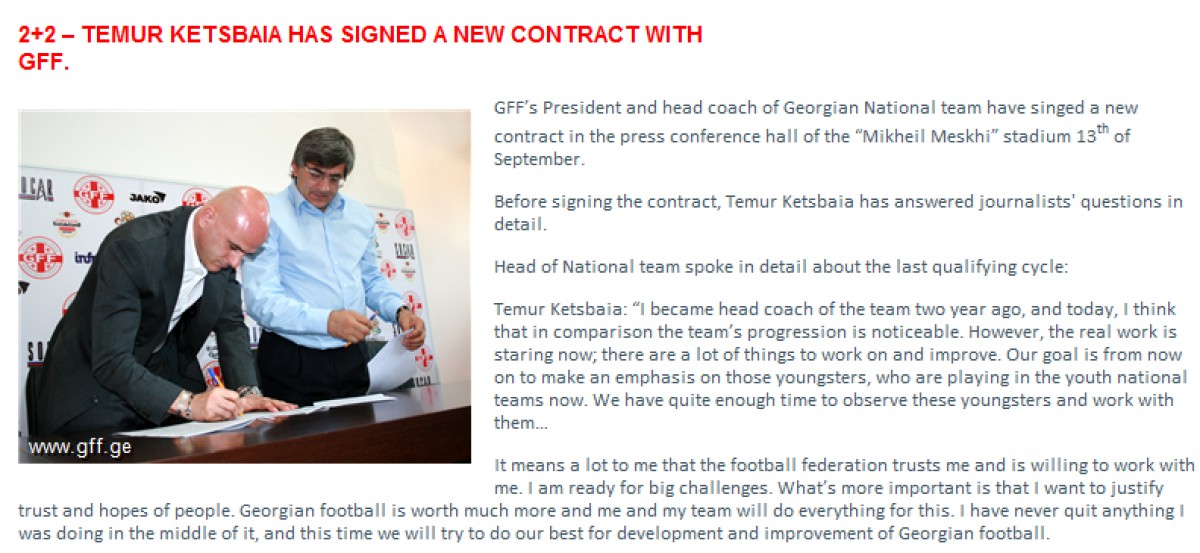 იკითხავთ, სად აქვს ინფორმაცია საქართველოს ფეხბურთის ფედერაციის საიტს, რომელიც ზოგადად პირველწყარო უნდა იყოს ასეთი ამბებისა. თუმცა ფედერაციის საიტის ინგლისურენოვან ვერსიაში ვნახეთ შავით თეთრზე დაწერილი ინფორმაცია – "2+2 ქეცბაიამ ფედერაციასთან ახალი კონტრაქტი გააფორმა". ეს ინფორმაცია იდო საიტზე 2011 წლის 13 სექტემბრიდან მოყოლებული დღემდე!!! დიახ, დღემდე და დაახლოებით ერთი საათის წინ შეიცვალა ტექსტი – ახლა სათაურში არსად არ წერია 2+2 და ტექსტიც გადაკეთებულია, თუმცა დარჩა ფოტო, რომელსაც სტატიის თავში ხედავთ: