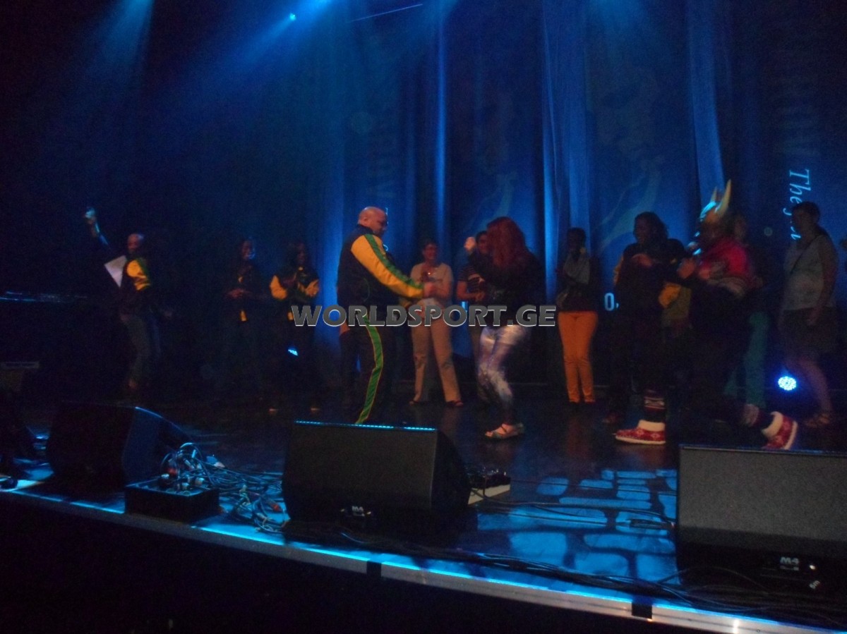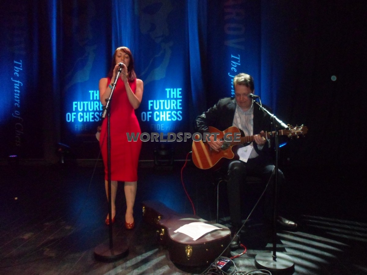 როგორც იქნა, საღამოს წამყვანმა იკადრა და სცენაზე გამობრძანდა. მისი ენაწყლინობა, მაინც მგონია, რომ წყლის ნაყვა იყო, რადგანაც ეჭვი მაქვს, თავადაც არ ჯეროდა ხვალინდელი გამარჯვების (შეგახსენებთ, ხვალ, 11 აგვისტოს აირჩევენ ფიდეს პრეზიდენტს). პუბლიკის გამხნევების მცდელობის შემდეგ სცენაზე იხმო ინგლისელი დიდოსტატი ნაიჯელ შორტი და ასევე ცნობილი გერმანელი დიდოსტატი ელიზაბეთ პეჰტცი. ამათ დუეტში შეასრულეს პოპულარული ინგლისურენოვანი სიმღერა - "ჩან'ტ ჰელპ ფალლინგ ინ ლოვე". ქალბატონი პეჰტცი რიგიანი მომღერალი აღმოჩნდა, თუმცა, ცხადია, მოჭადრაკეთა მარაქისთვის; შორტი გიტარით უკეთებდა აკომპანიმენტს, მაგრამ მისი ოსტატობა კიდევ უფრო სამოყვარულო დონის იყო. რა თქმა უნდა, აქ პრეტენზია არავის უნდა ჰქონოდა და, ამას, პირველ რიგში, შორტიც აღნიშნავდა, რომელსაც რამდენჯერმე აკორდთა თანმიმდევრობაც შეეშალა.