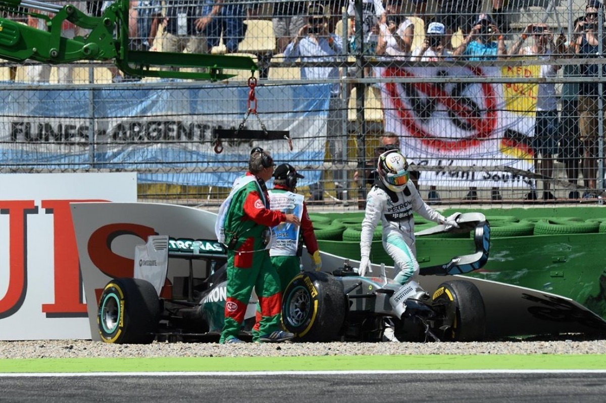 50 გრადუსამდე გადახურებულ სიცხეში, მოსახვევ „საქსის“ გავლისას, სადაც „მერსედესის“ ტრიბუნაა, ჰამილტონის მანქანაზე წინა მარჯვენა მუხრუჭი დაზიანდა. მანქანა მაშინვე უკონტროლო გახდა და იქვე დალაგებულ საბურავების სამრიგა მწკრივს დაეჯახა. შეჯახება მძიმე იყო, თუმცა ბედად, ჰამილტონი ტრავმას გადაურჩა. სამწუხაროდ, მანქანა ისე დაზიანდა, რომ კვალიფიკაციის მეორე სექტორში ბრიტანელმა გამოსვლა ვეღარ შეძლო. რბოლა რამდნმე წუთით შეწყდა, სანამ დამტვრეული მანქანის ევაკუაცია მოხდებოდა. აქვე უნდა ითქვას, რომ ჰამილტონის და როსბერგის მანქანები გასხვავებული მარკის მუხრუჭებითაა აღჭურვილი, რაც ბრიტანელის პირადი გადაწყვეტილებაა.