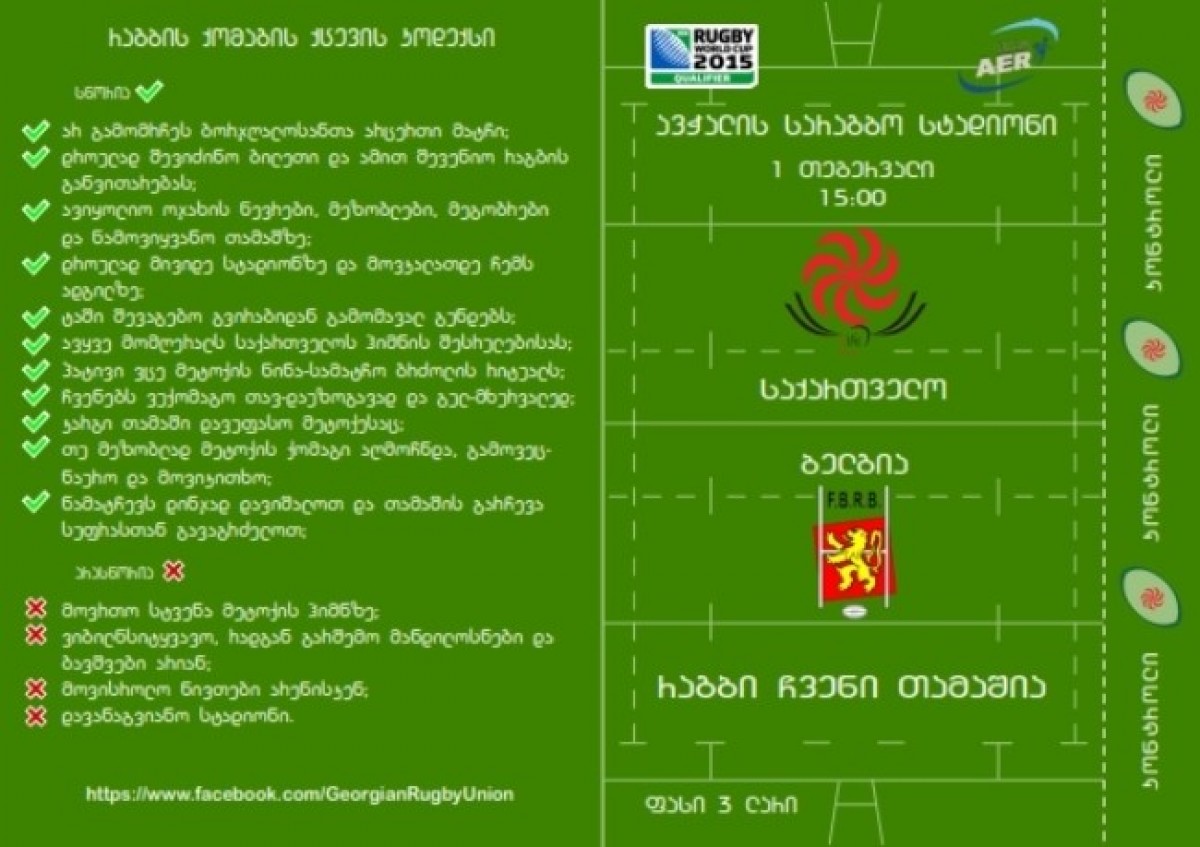 საქართველო-ბელგიის მატჩის ბილეთები საქართველოს რაგბის კავშირში (ი. ჭავჭავაძის გამზირი 49ა) 27 იანვრიდან ყოველ დღე, 12:00 საათიდან 18:00 საათის ჩათვლით გაიყიდება.