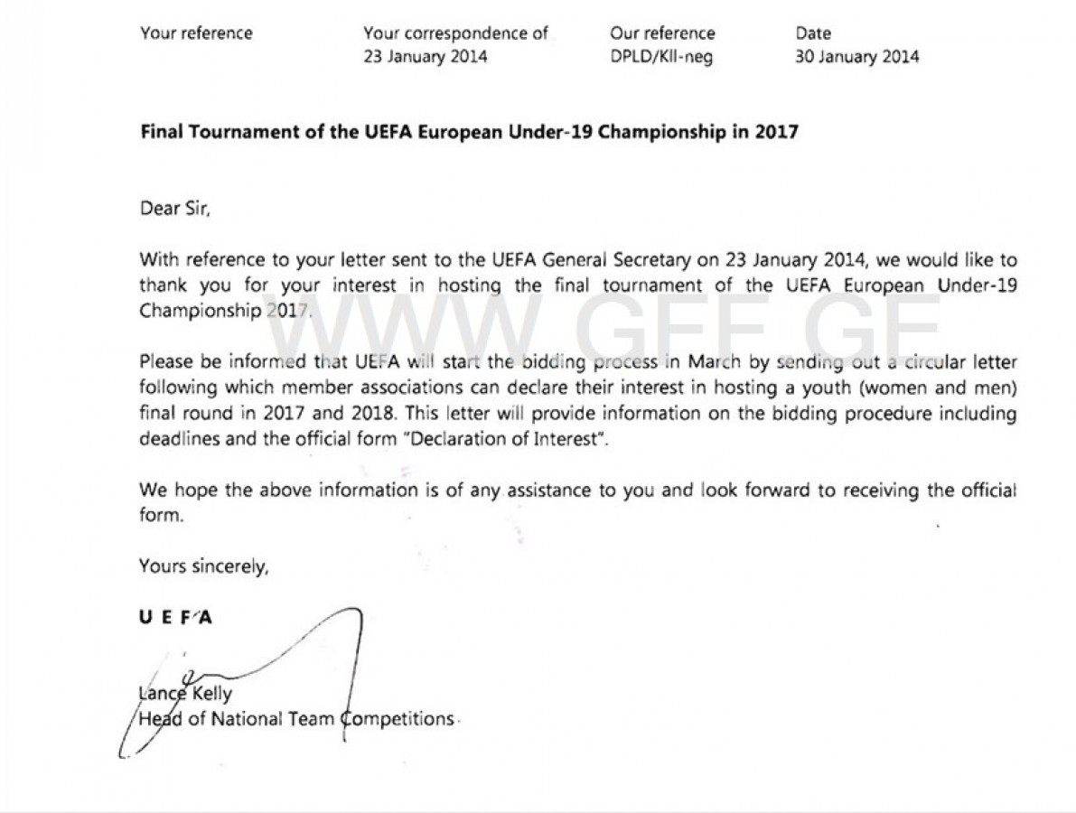 “უპირველესად, მადლობას გიხდით, რომ გამოთქვით სურვილი და ინტერესი 2017 წლის ევროპის 19-წლამდე ჩემპიონატის მასპინძლობისა. გაცნობებთ, რომ მარტიდან, უეფას ყველა წევრ ფედერაციას დაეგზავნება სპეციალური წერილი და ცირკულარი და შეძლებთ ოფიციალურად დააფიქსიროთ ჩემპიონატის მასპინძლობის სურვილი.