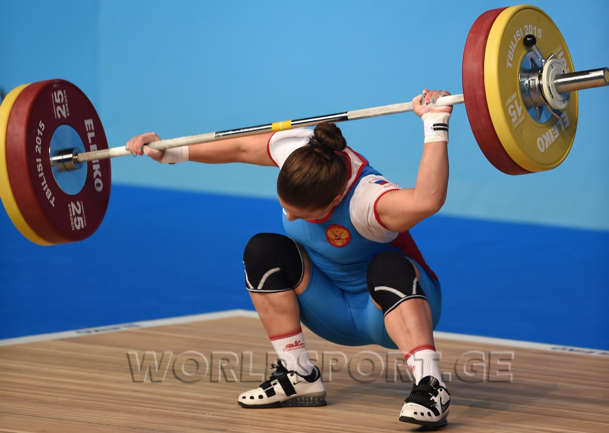 В первом движении она в первом же подходе подняла штангу весом 70 кг, а для того, чтобы поднять 74 кг, ей понадобились уже две попытки.