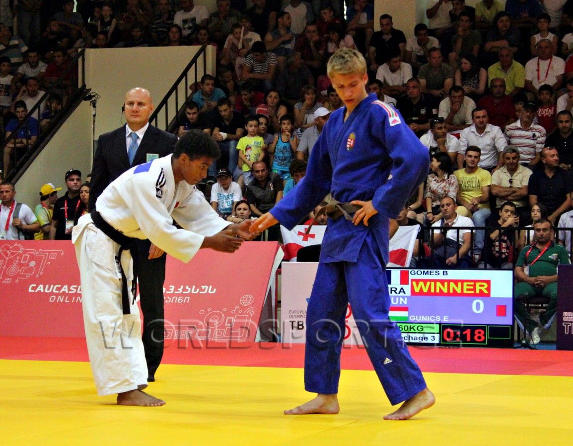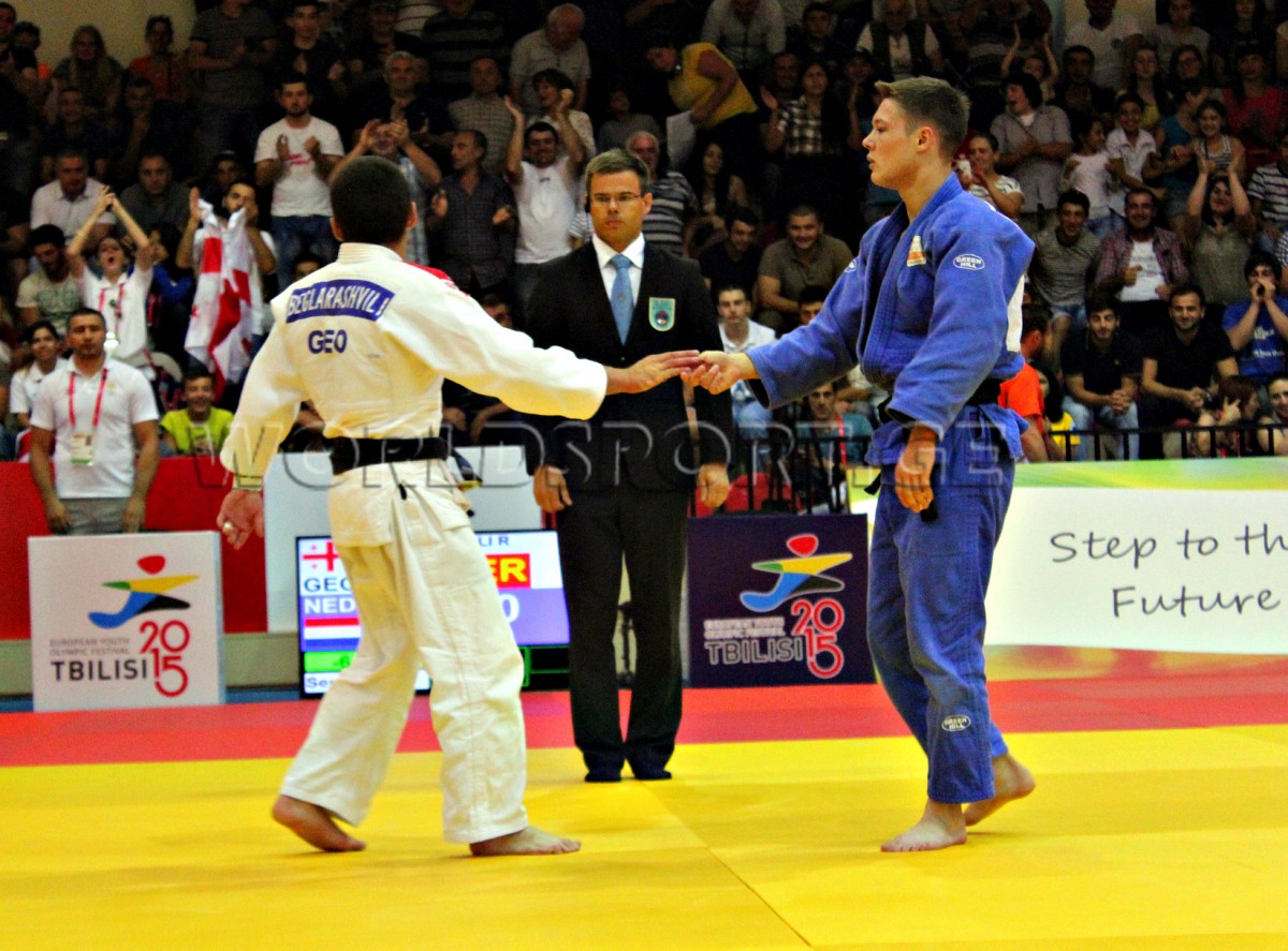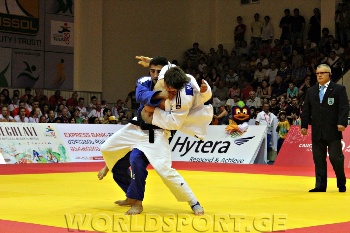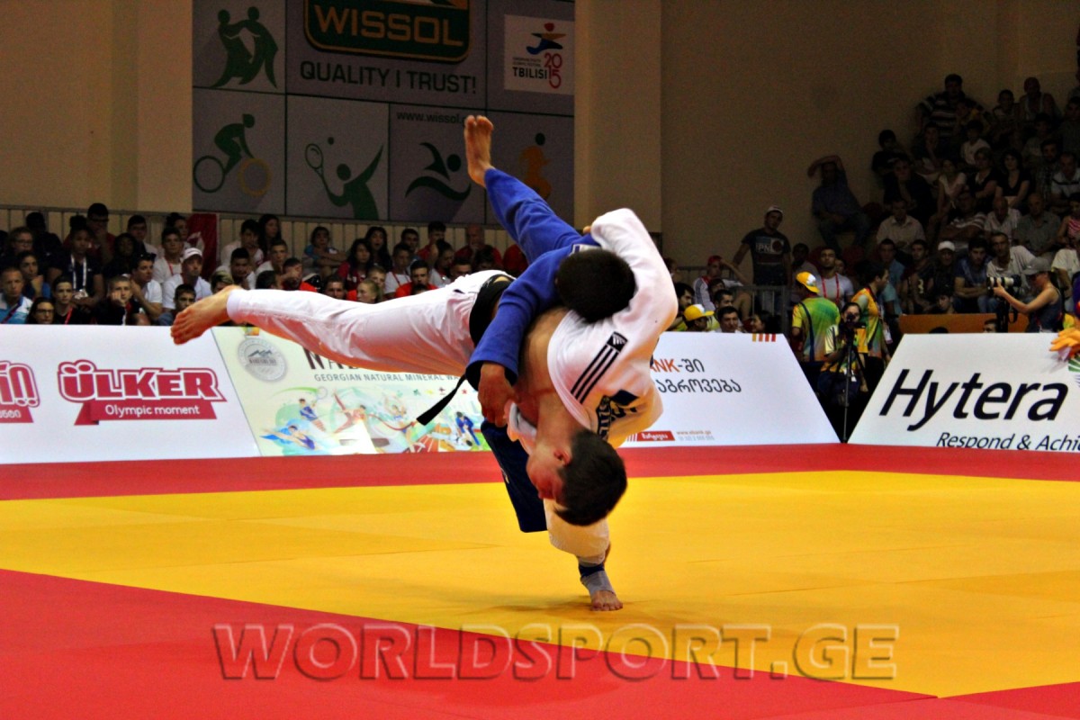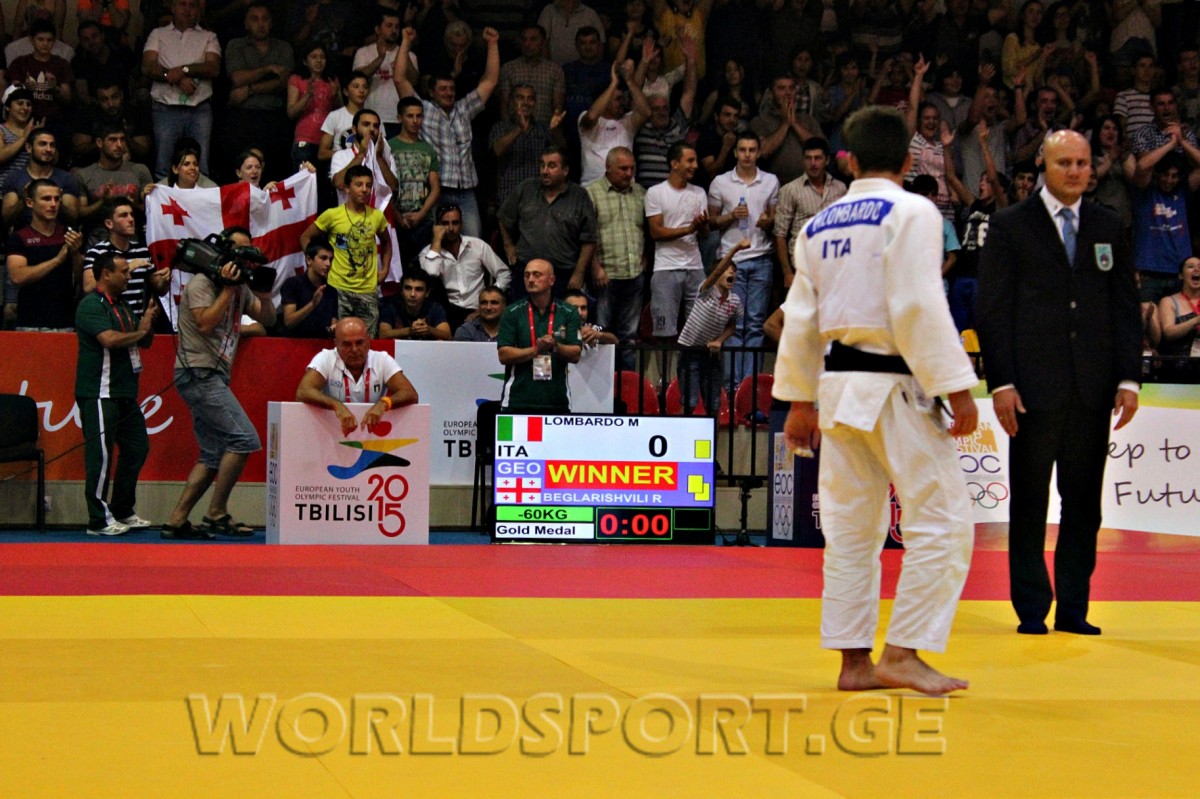 Сборная Грузии по дзюдо открыла счет золотым медалям на проходящем в Тбилиси Европейском молодежном олимпийском фестивале. На высшую ступень пьедестала взошел выступающий в весовой категории до 60 кг Робинзон Бегларашвили, который в решающей схватке одолел действующего чемпиона Европы итальянца Мануэля Ломбардо благодаря вазари.