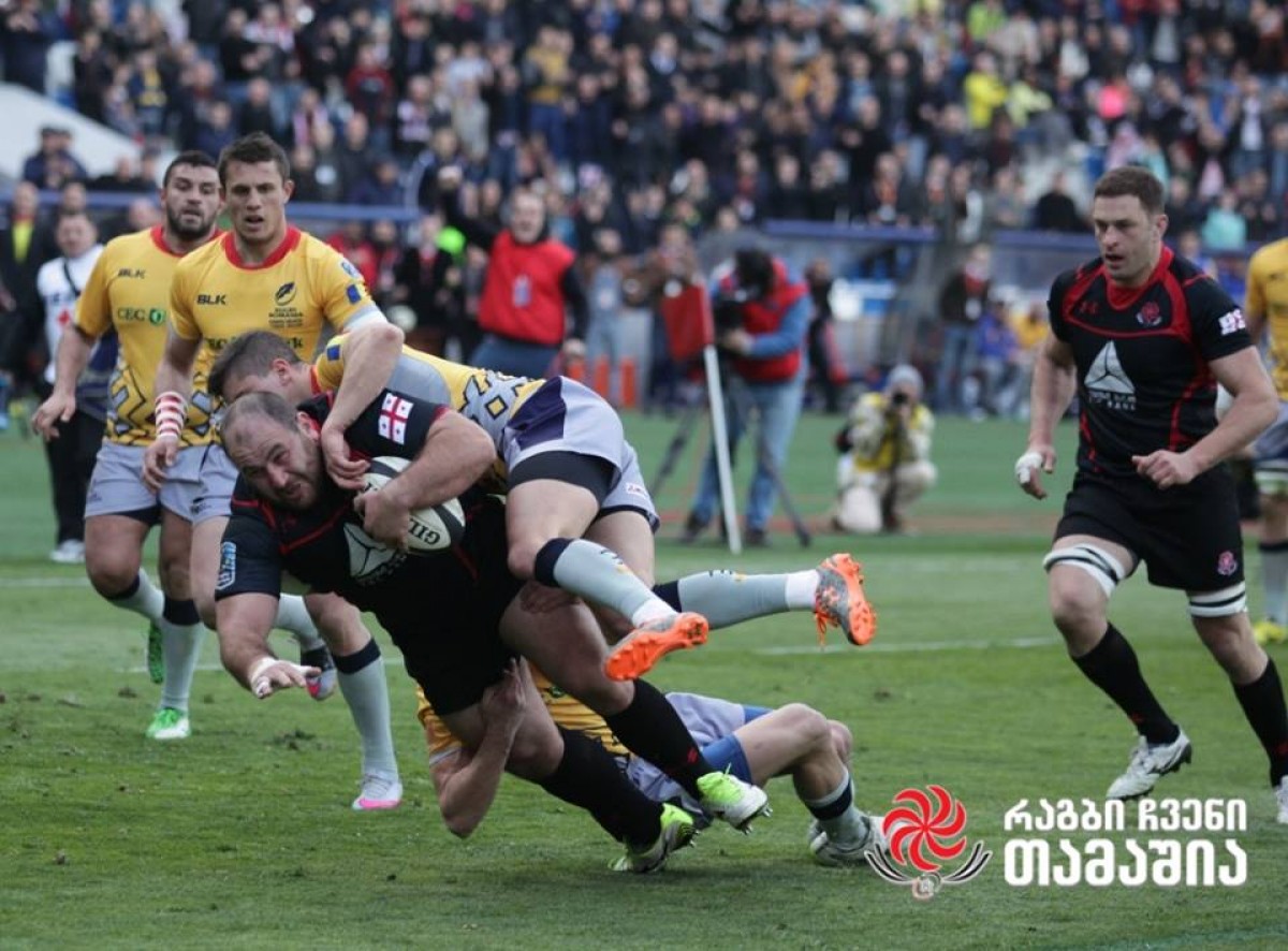 Матч в Тбилиси на «Динамо арене» проходила с полним преимуществом «Борджгалоснеби». Грузины открыли счёт на третье минуте попыткой Антона Феикришвили. В первом тайме грузинская команда занесла три попытки (два раза Феикришвили, один раз Сандро Тодуа), Мераб Квирикашвили осуществил две реализации, а румыны только за счёт штрафных сокращали счёт. Тайм выиграли хозяева со счётом 19:9.