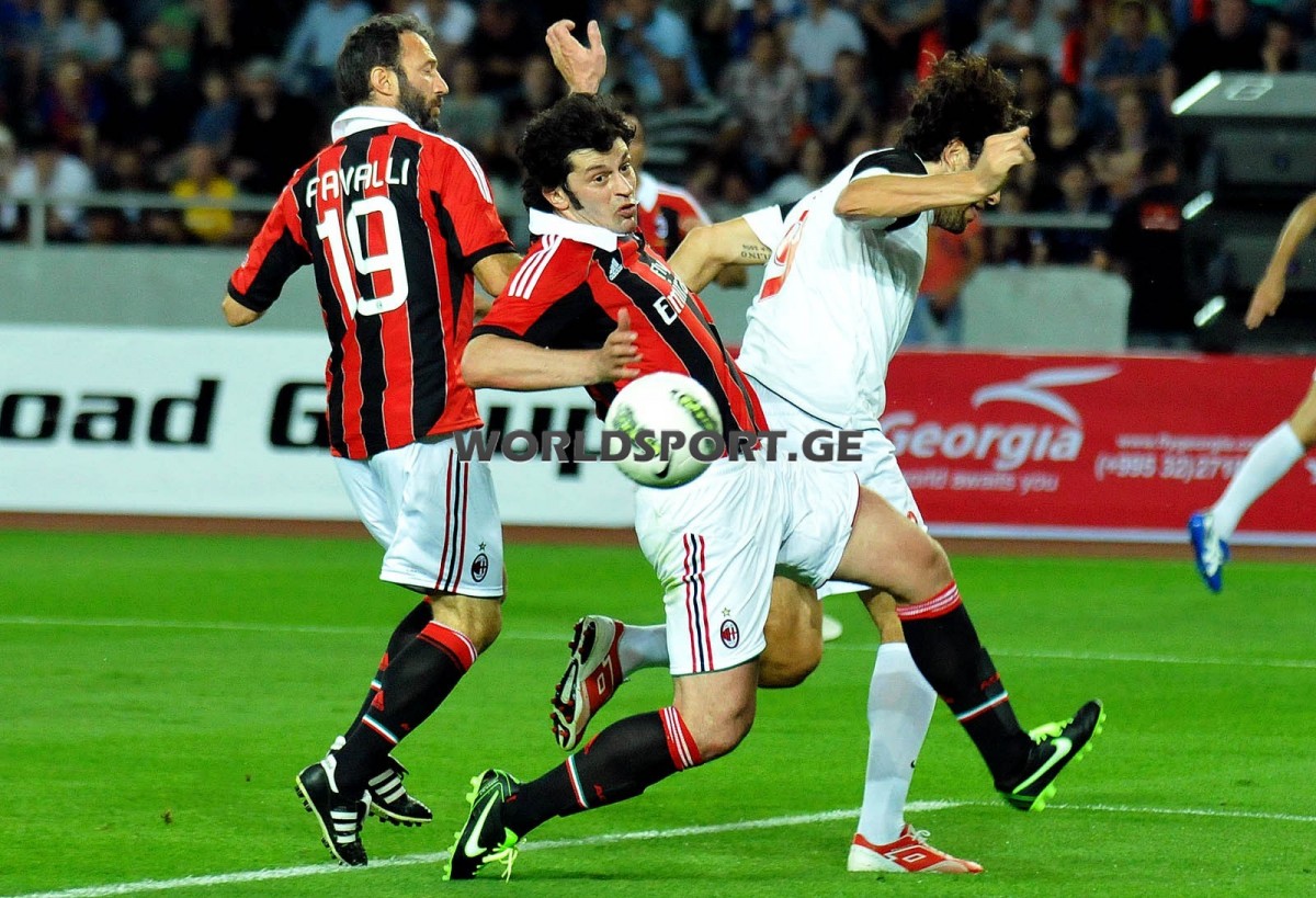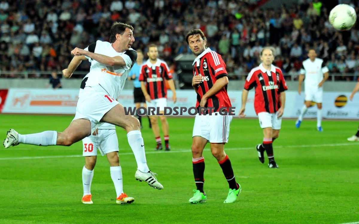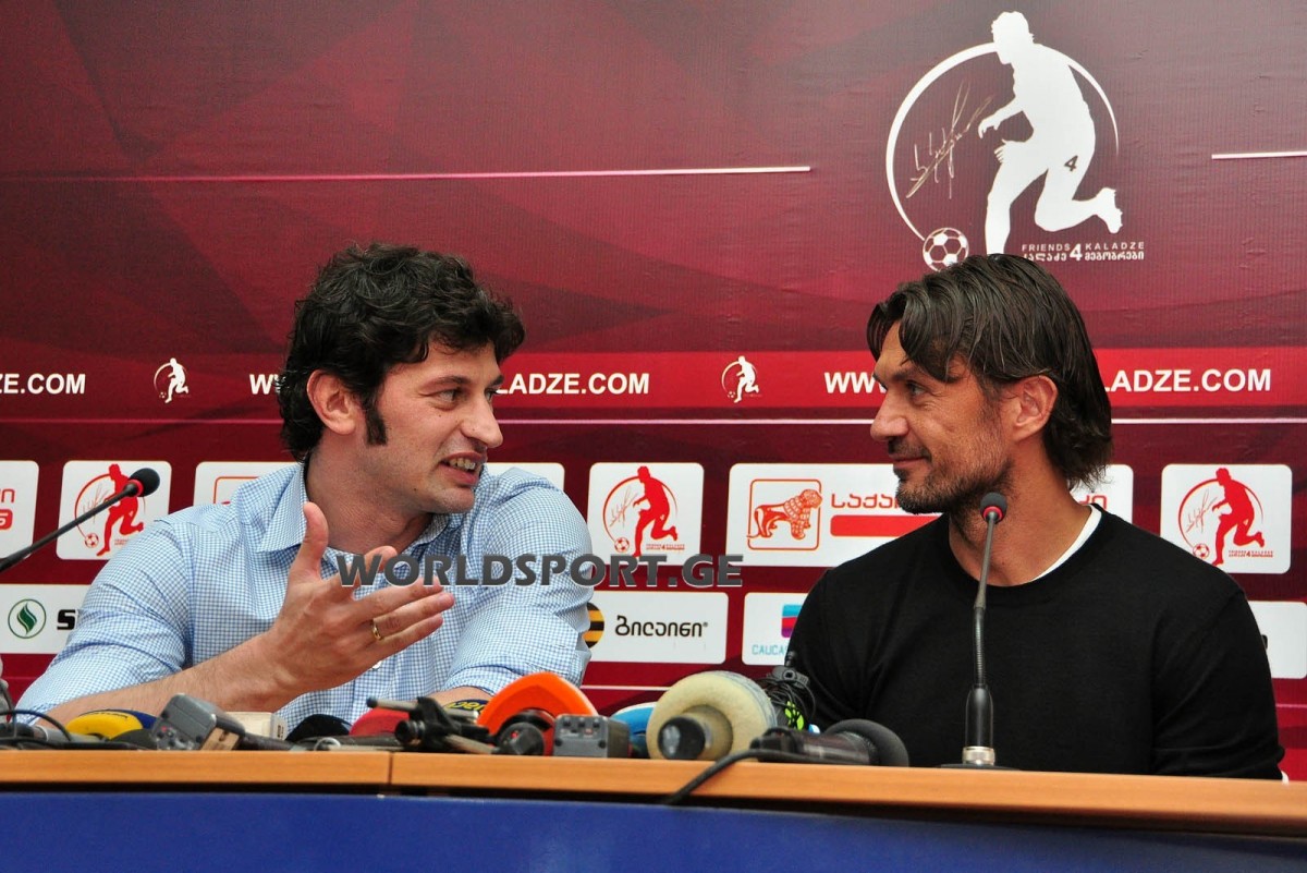 После прощального матча Кахи Каладзе в медия-центре “Динамо-Арены” прошла пресс-конференция. Перед журналистами предстали великолепные игроки “Милана” недалёкого прошлого Даниеле Массаро, Массимо Одо и, наконец, неповторимый Паоло Мальдини. А из грузин нам оказали честь Шота Арвеладзе, один из главных организаторов матча Давид Муджири и, разумеется, сам Кахи Каладзе: