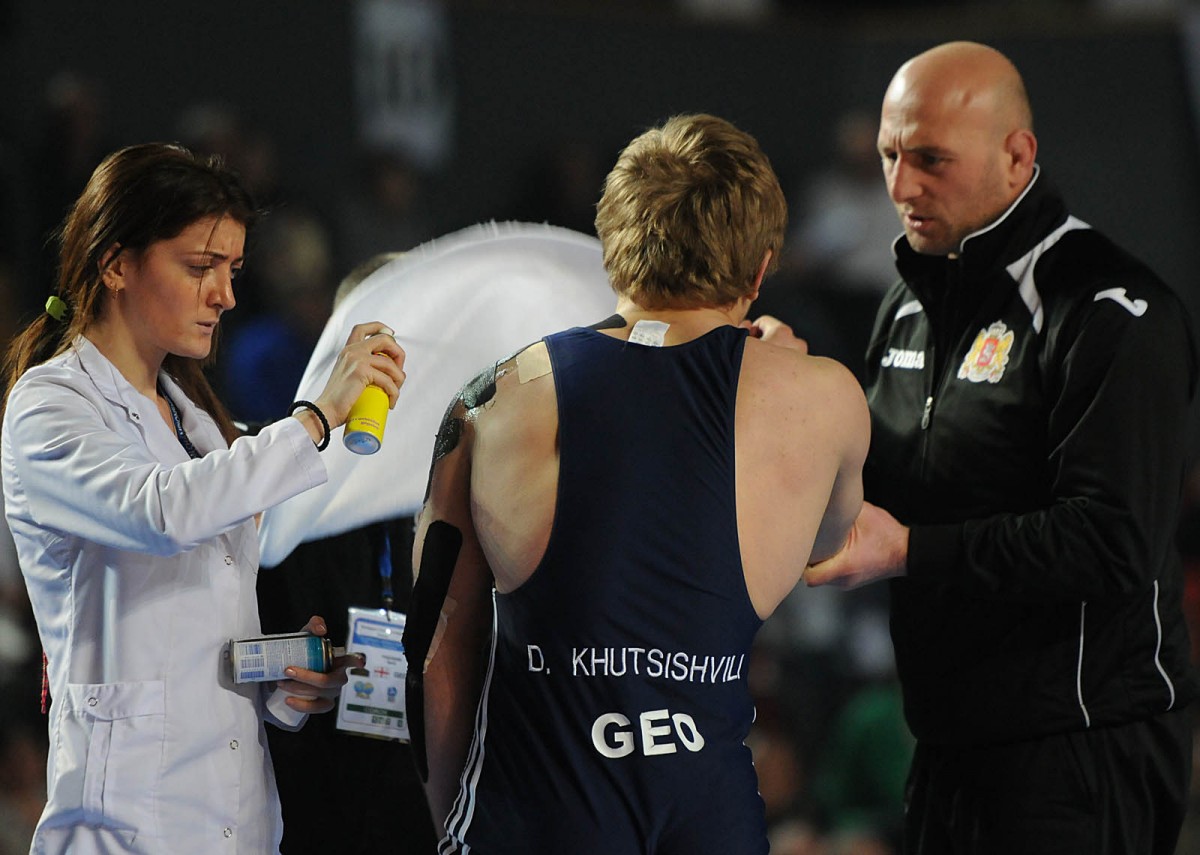Выступающий в весовой категории до 74 кг Давид Хуцишвили выступление на чемпионате Европы завершил поражением в полуфинале репешажа от болгарца Леонида Базана. Член сборной Грузии по вольной борьбе в первом периоде проиграл из-за предупреждения. Хотя за несколько секунд до окончания двухминутки он и сравнял счёт эффектным приёмом, исполненным одной рукой, но победа всё-таки осталась за противником, который владел преимуществом предупреждения.